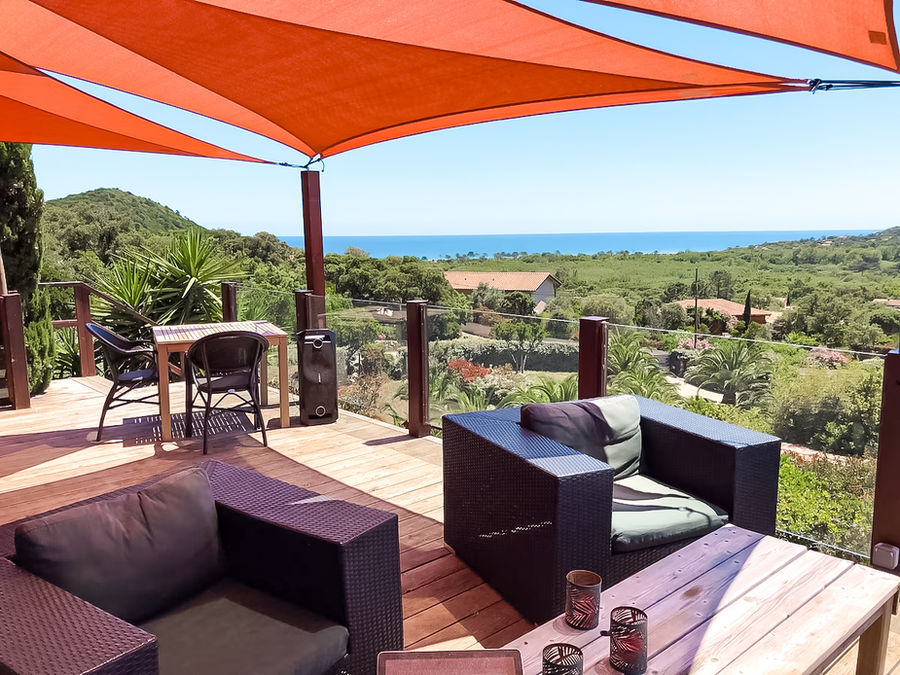 Vue sur la mer, piscine privée et terrasse avec barbecue.